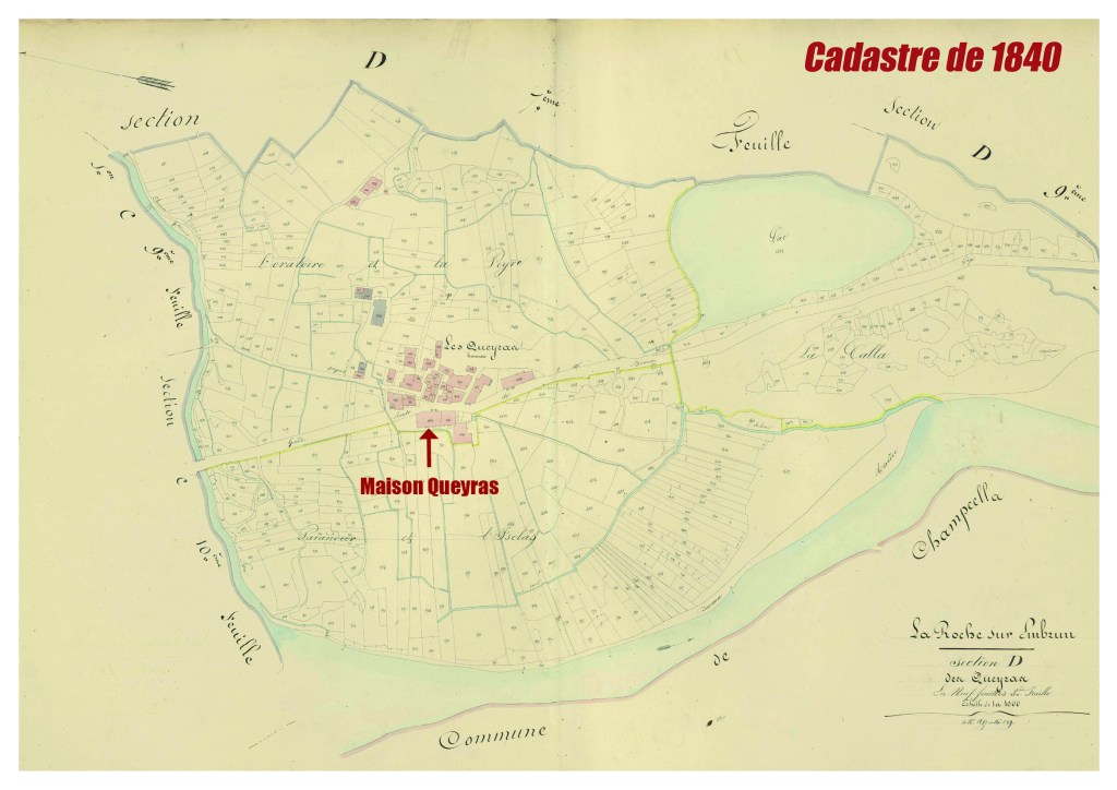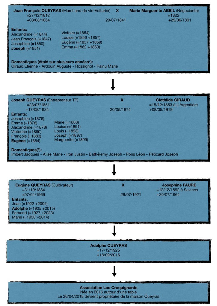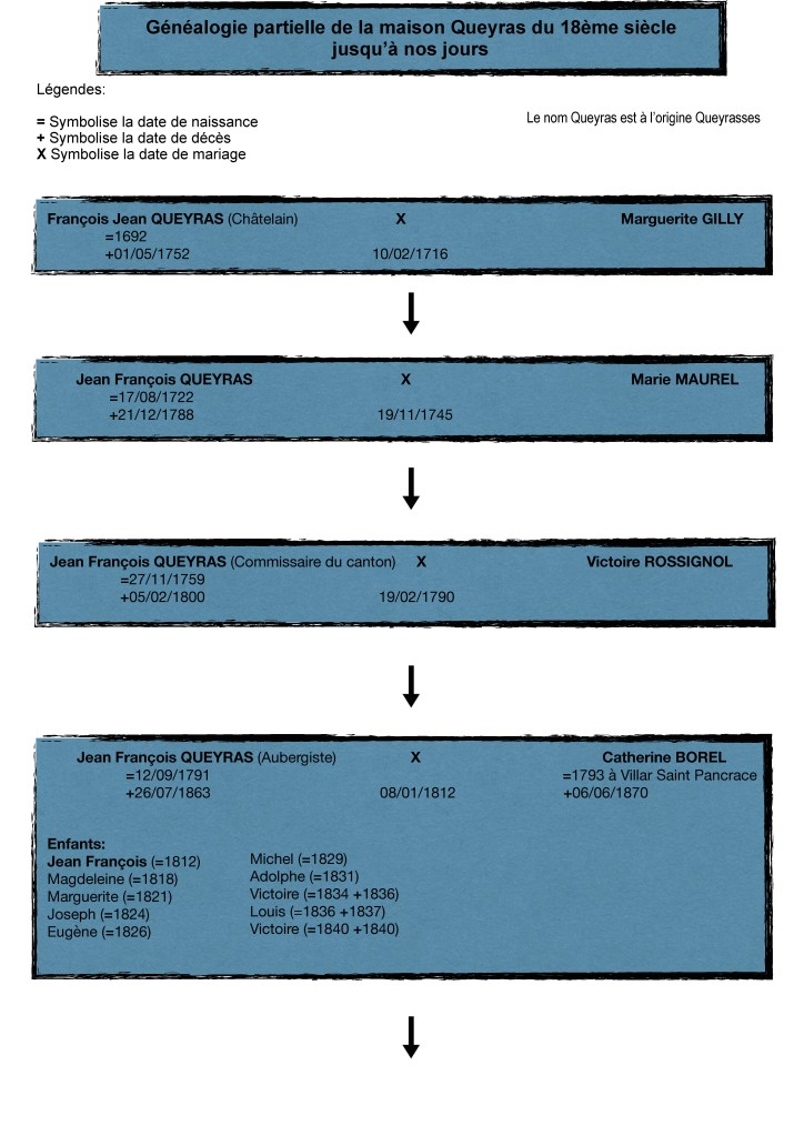 Toutes les maisons n’ont pas une histoire. La maison Queyras en a une et pas des moindres. Elle est longue, semée de vie et de mort entre ses murs. Pas moins de 8 générations s’y sont succédé depuis la fameuse date frappée au ciseau à bois sur la sablière de la charpente (1801). Elle a accompagné au cours des siècles le bruit des fers à cheval battants le pavé, les roues des diligences claquantes sur la chaussée, les odeurs de soupes et de ragoûts en tout genre envahir les narines des voyageurs. Elle a pu écouter les ronflements de ces derniers, envahissants l’antre de la bâtisse après s’être endormis, bercés par le roucoulement des pigeons voyageurs à l’étage.