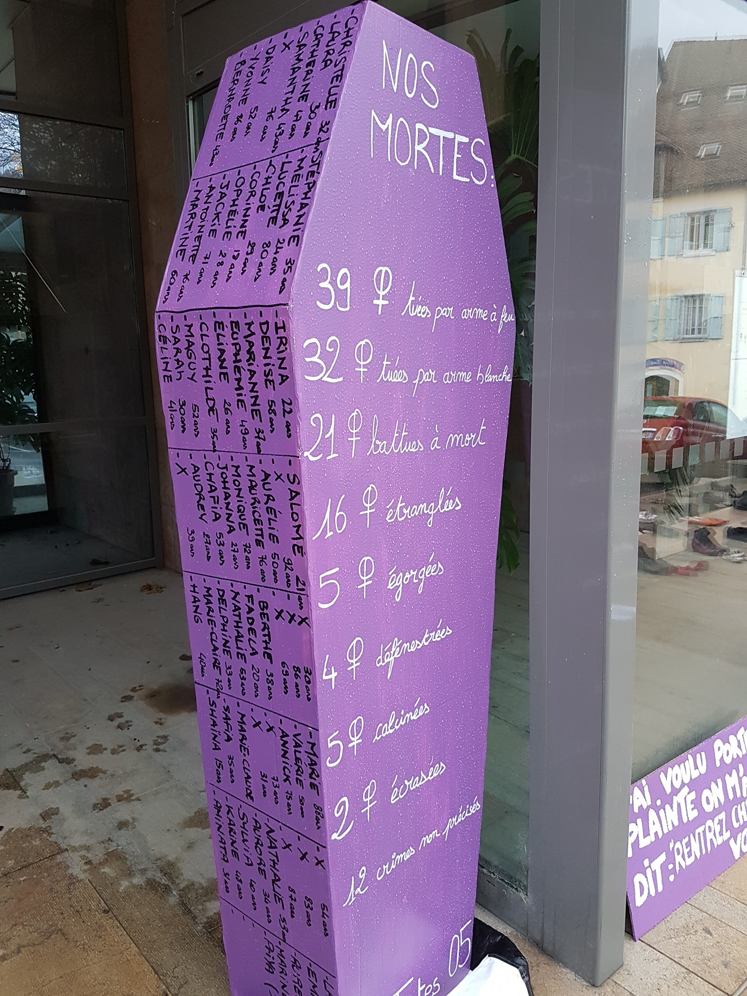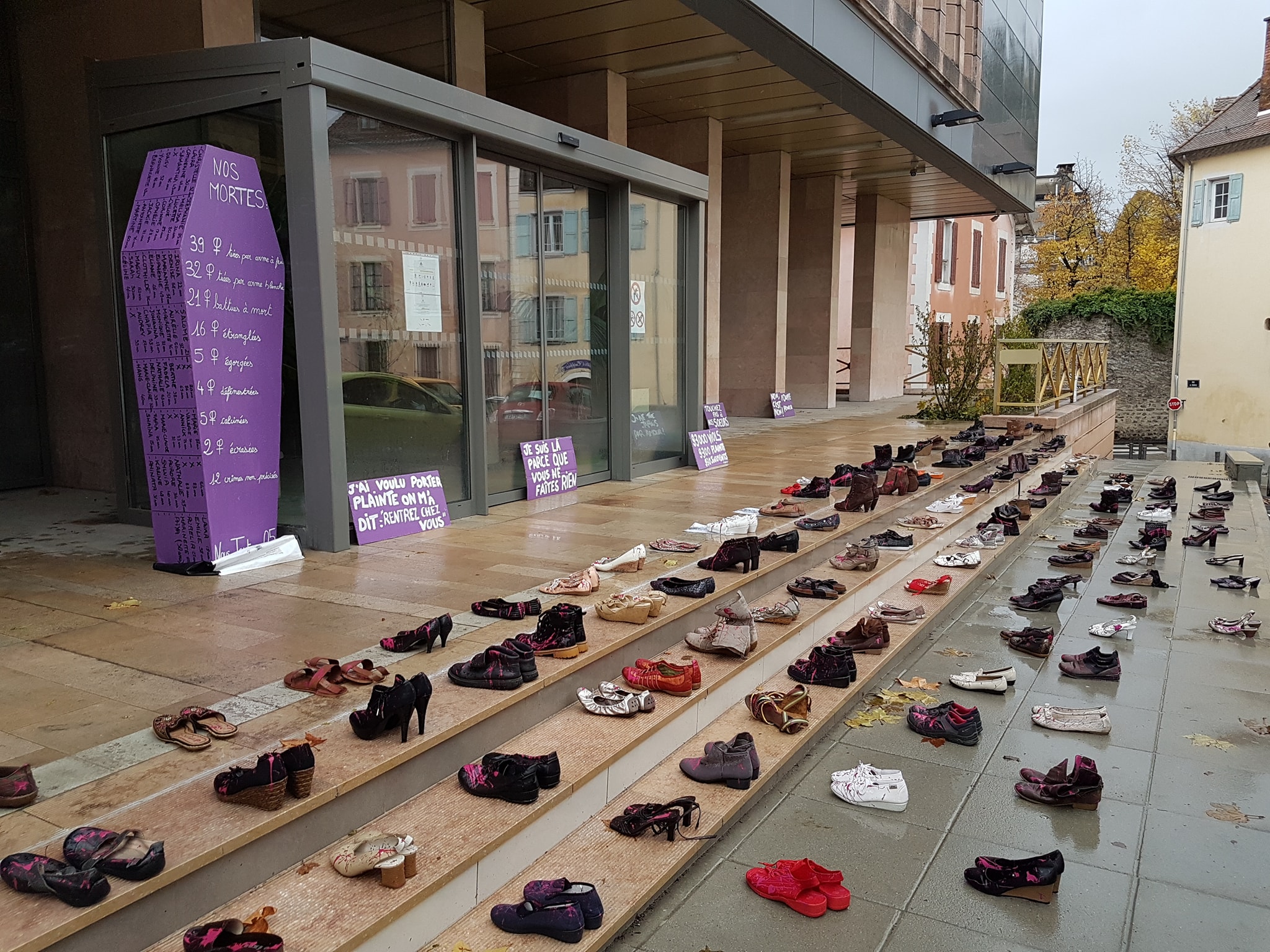 Marche contre les violences sexistes et sexuelles du 23/11/2019 à Gap. Participation à la réalisation du cercueil et sur la personnalisation des 137 paires de chaussures.