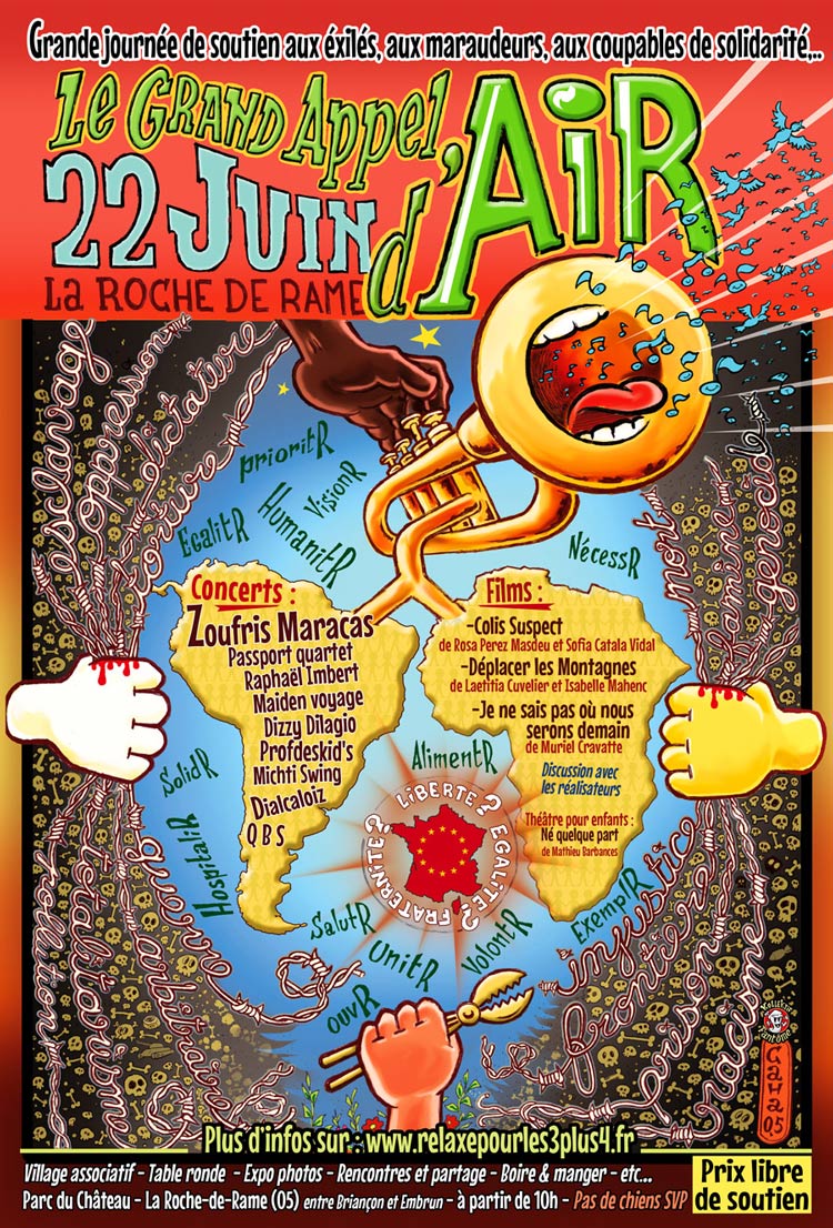 -Le 22 juin, organisé par le Comité de soutien aux 3+4+2+… de Briançon avec la participation d’un grand nombre d’associations, une grande journée pour les exilés, les maraudeurs, les solidaires et les coupables de solidarité a eu lieu dans le parc du château à la Roche-de-Rame.