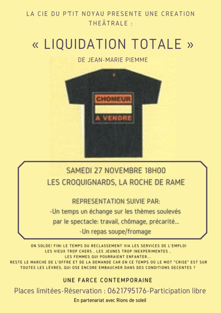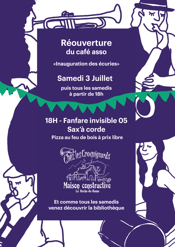 Nous avons accueilli quelques rencontres de collectifs et d’assos,il y a eu les rencontres Acupunk, la réouverture du café asso avec la nouvelle fanfare, les Rencontres de la Haute-Romanche qui a posé ses scènes aussi aux Croquignards, les festival d’arts visuels Hudre#O.2 avec 15 jours d’animation, à l’automne le week-end Systema, puis la 4ème édition de Délires à graver sur le thème (Ni dieu, ni mâitre », de la poésie avec Yves Artufel et du Théâtre avec Liquidation Totale organisé par Rions de Soleil, et notre journée « S’aider pour ne pas s’aider » avec le Secours Populaire.