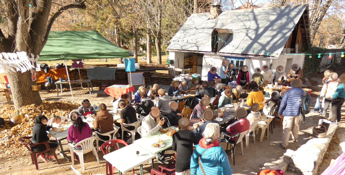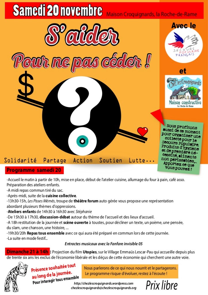 En partenariat avec le Secours populaire qui a organisé une grande cuisine collective en journée, où chacun a pu se rencontrer et oeuvrer en commun pour le repas du soir. Le but était cuisinons et mangeons ensemble, échangeons. Avec cuisson de différents types de pain et vente à prix libre au profit du Secours populaire.